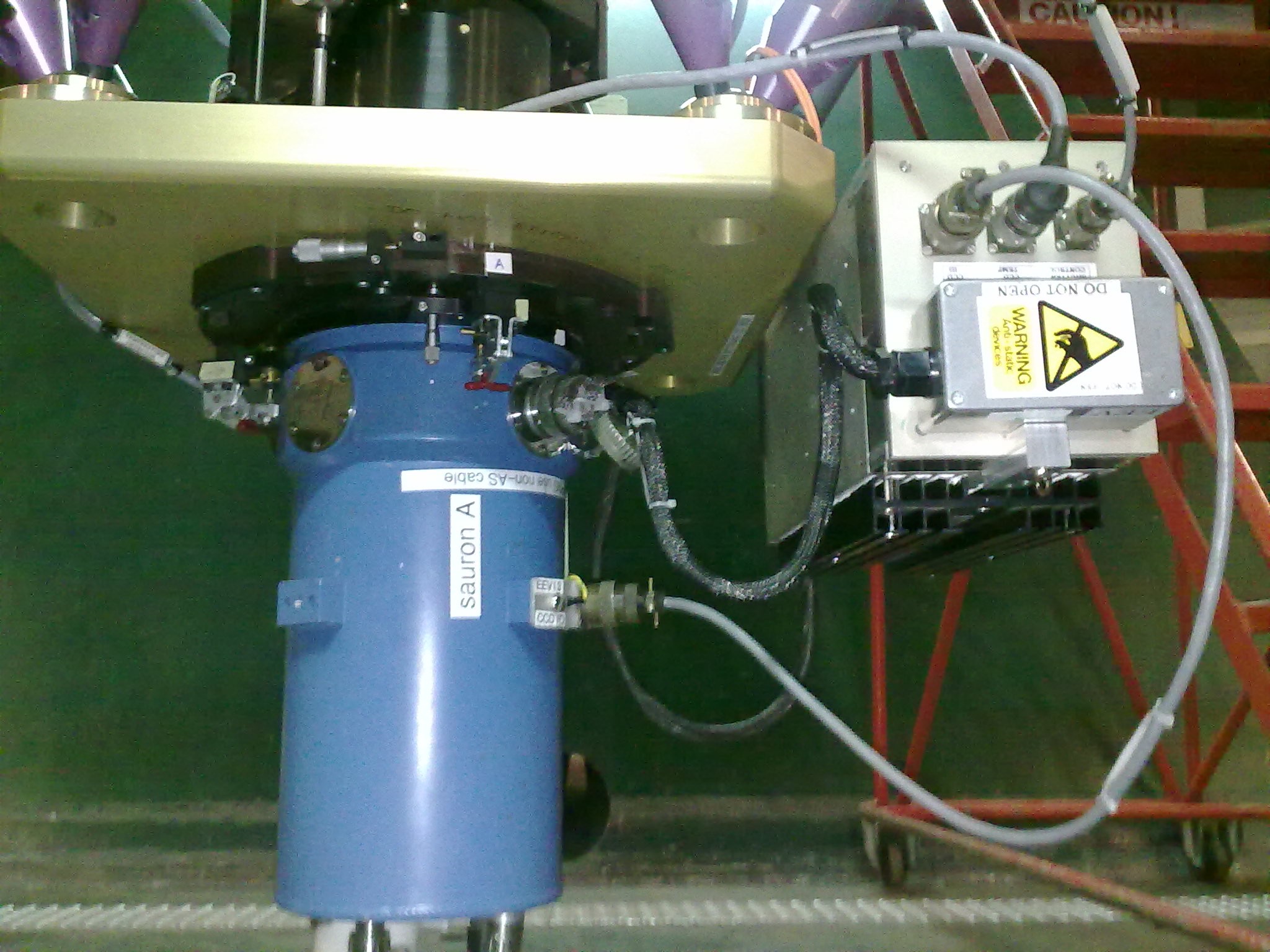 | 5. Mount the cryostat, ensure correct rotation. Capstan A on he EEV13 cryostat is clearly marked 'Sauron A' (see photo below) this must match the clamp marked 'A' on the instrument. | |