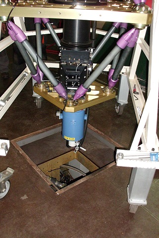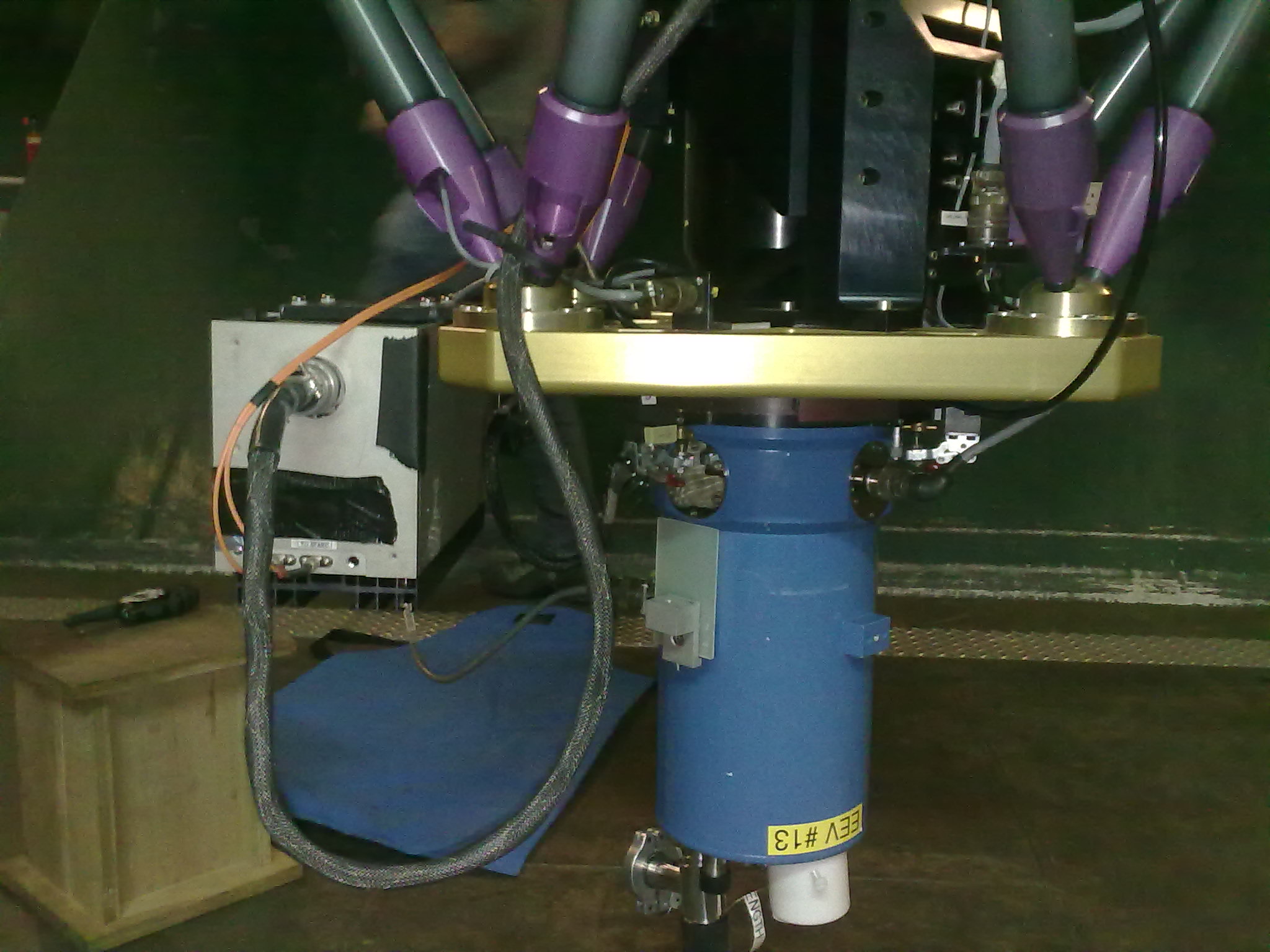 If this is the case the cryostat will hit the floor when the instrument is rotated to the vertical position. To avoid this the trap door on the rising floor must be removed and the instrument carefully manoeuvred to accomodate the cryostat. (see image)