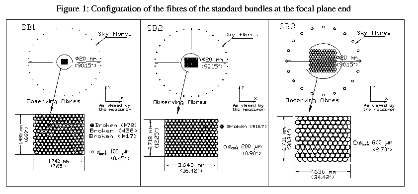 At the focal plane the fibres are arranged in two groups, one forming a rectangle, and the other a ring which is intended for collecting background light (for small-sized objects). Table 1 and Figure 1 show the main characteristics of each bundle.