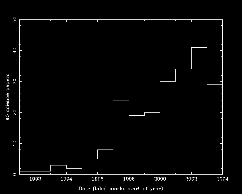 Counts of AO science (as opposed to technology, techniques) papers published worldwide, taken from the Keck web page: