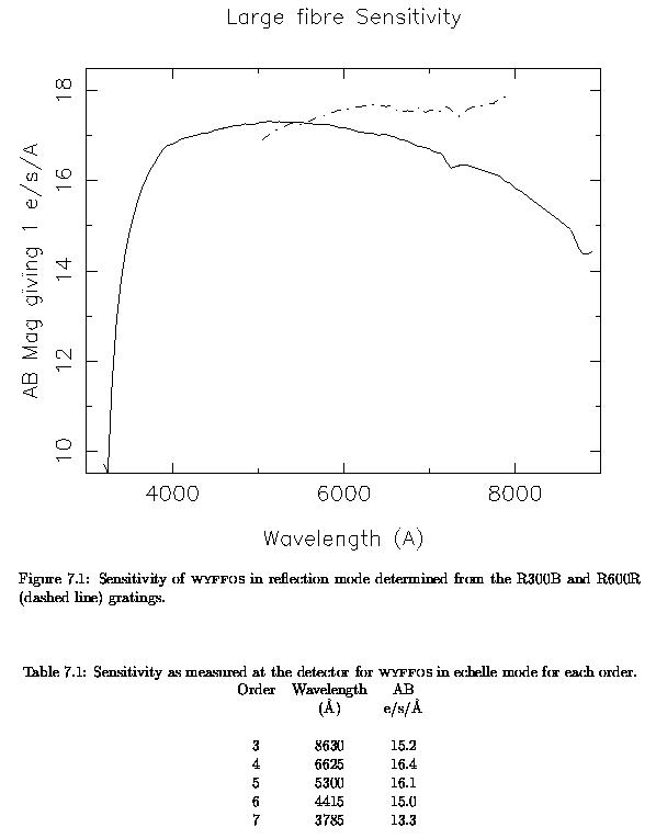 On October 2004, some first measurements of the absolute throughput of the Small Fibres and Wyffos Long Camera were obtained under variable seeing conditions of 1-1.3 arcsec. The following Table reports the magnitude of a star giving 1 electron/sec/Angstrom when observed at zenith (1 airmass). Numbers are scaled to the "median" fibre (i.e. to the median relative throughput).