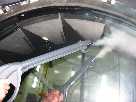 The ING invested in 3 industrial vapour cleaners to be used for the “vapour cleaning” process. Before the machines were used on a telescope mirror, extensive tests were done on similar coated mirrors. It was found that the vapour temperature does not damage the aluminised surface. Only if the vapour gun is pointed for 20 minutes on the same spot can degradation in the mirror coating be seen.