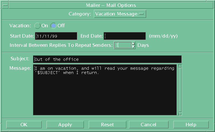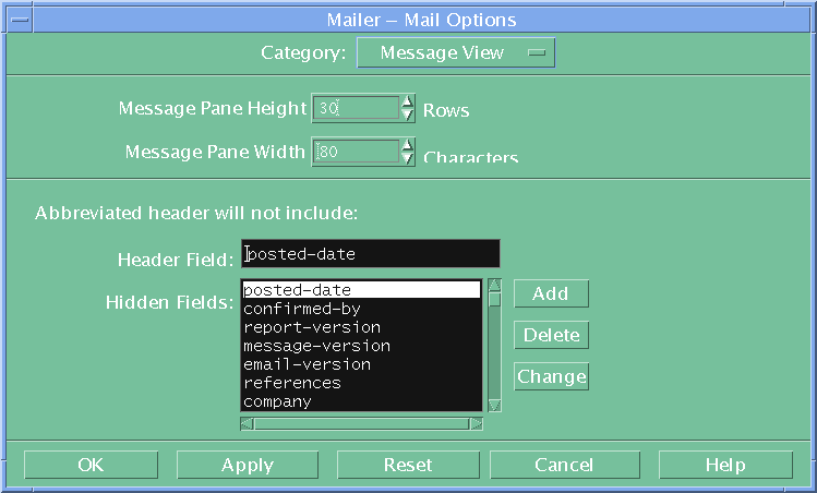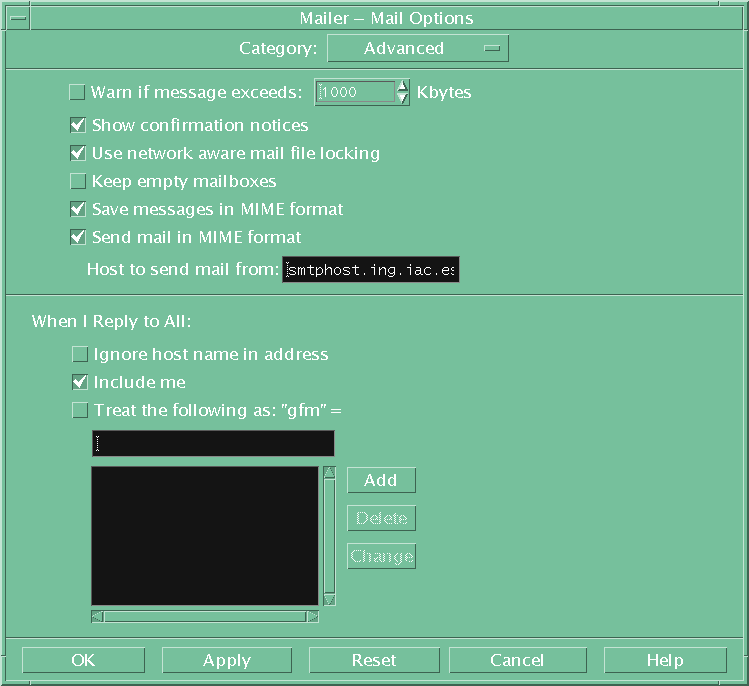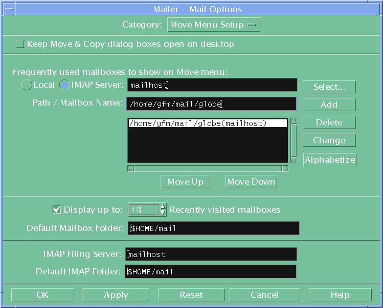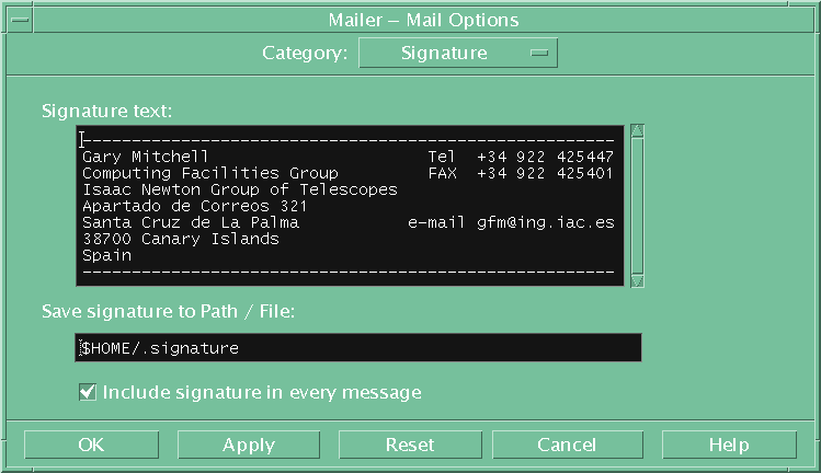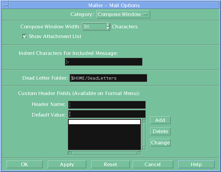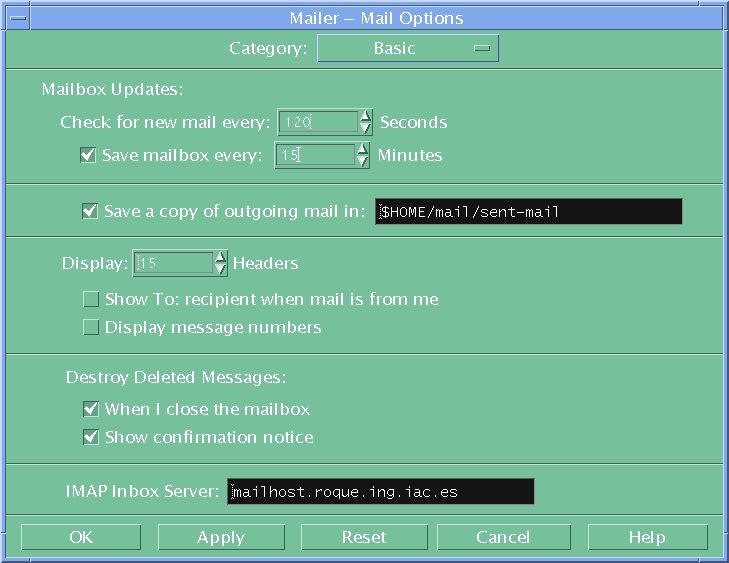Alternatively click on the mail-tray icon in the CDE tool bar and configure it using options All the recommended settings are provided for the 11 sections - but you need only do 3 to get started You can if you wish copy the and then fine tune it using CDE mail "Options" menu.
