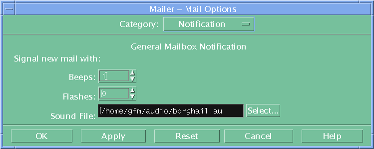/home/username/.mailrcYou should then carefully edit it to reflect your mail configuration (very few changes eg changing the sound file which is played when mail arrives to something else eg an audio file (xxx.au) in /usr/dt/appconfig/sounds/C )