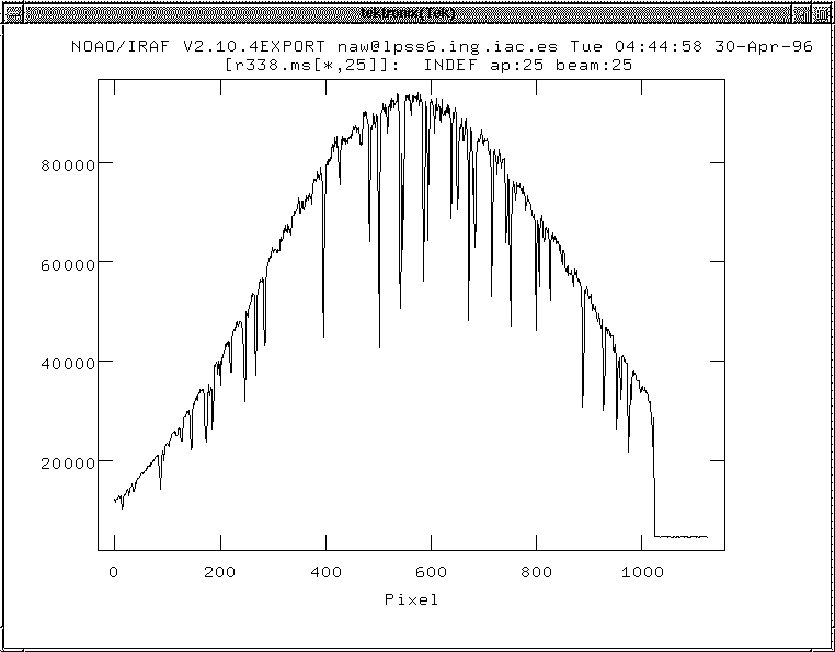 ESA-MUSICOS first light on first night at INTThe first science exposure was obtained at about UT 01:00 April 30 1996. The image shows a 5 sec integration on alpha Boo. An extracted order at about 5800 Å is shown This second copy of the MUSICOS spectrometer has been built at ESA-ESTEC by Bernard Foing, Thierry Beaufort, and Eric Stempels (Leiden). The science team has been led by Rudolf Le Poole, and for this commissioning run has included Jeroen de Jong, Philippe Gondoin and Joana Oliveira. Local support was provided by Daniel Mathews, Bart van Venrooy, Claudio Moreno and members of the ING staff. Results and future plansThe technical operations, data analysis and scientific results from the commissioning run are described in the theses of Joana Oliveira and Eric Stempels, and in papers in the litterature.Based on the satisfactory results obtained at INT and on the interest from the community, Bernard Foing has proposed to offer the ESA-MUSICOS spectrometer for collaborative use in semester 97A, and for open use after this period. |