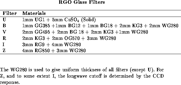 These filters have been made at RGO from various cemented combinations of Schott glass. R W Argyle specified the combinations, which are similar to those in use at the AAT, SAAO and elsewhere. These filters are 2 inch in size, and Table B.2 shows details of these filters. Three sets exist; two sets for the ING telescopes, and one set at RGO. These filters are on the Johnson system. Nowadays, this system (for R and I) is not used very often any more, possibly because of the large sky background. At La Palma the RGO R and I are seldom used. The U,B and V filters however are not very different from U, B and V filters on other systems. See Fig 15 for the scans of these filters.