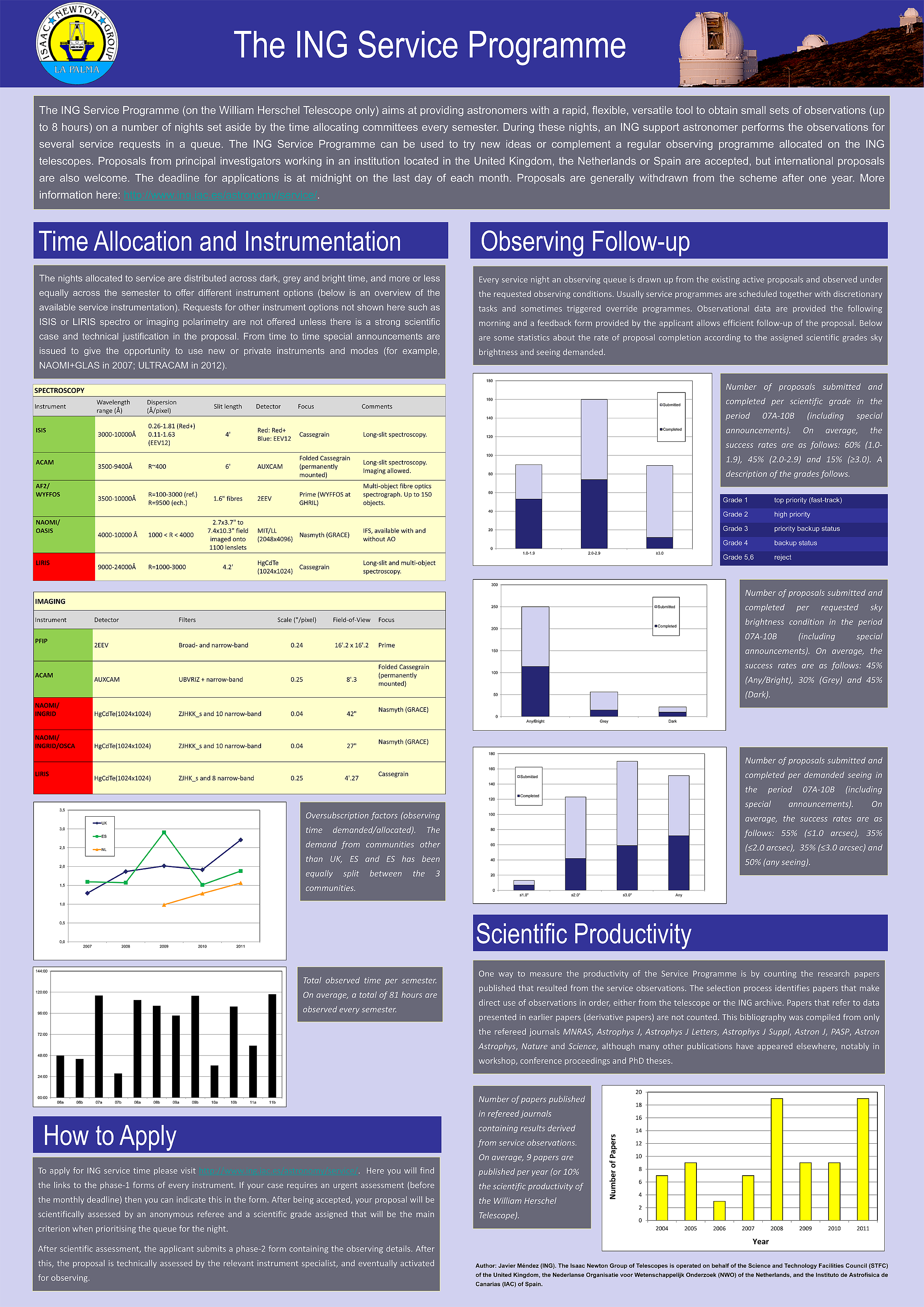 Grade 2 proposals will be attempted as high priority, and should get done over the active 1-year lifetime of the proposal, weather and instrument availability permitting. Grade 3 and 4 proposals will only be attempted when there are no higher graded proposals in the queue, and there is therefore no guarantee that they will be attempted at all. Grade 5 and 6 proposals will not be attempted. Service active and attemptable proposals are queued every service scheduled night. Please remember that in general there will be several high priority proposals in the queue waiting to be done and that weather or technical downtime could prevent observing. Applicants should also be aware that service time is allocated to each hosting institution's nationality (UK, NL or ES) on a very strict time basis, and therefore not all highly-rated proposals from a particular nationality will necessarily be completed. The service time allocation provided by every time allocating committee is taken by the Service Manager for reference and tracks the use of service observing time to reflect this nationality time share over the semesters. Principal investigators whose proposals are attempted will be contacted by the Service Manager shortly after the service night, usually via an ING Service Night Report. They will normally be asked to FTP the data back to their home site. The ING Board and the International Scientific Committee (CCI) have decided that data belong exclusively to those who requested it for a period of one year. After this time it enters the public domain and it can be retrieved from the ING archive. Service observations are similarly treated. However, calibration data may well be used for more than one observation and may therefore be available for several groups. It may happen that identical or similar service observations are requested by two or more applicants. Requests which are approved before the data are taken may be satisfied by requiring the data to be held in common by the several groups. It is up to them how they organise themselves to process it, analyse it, relate it to other work, and eventually, presumably, publish it. |