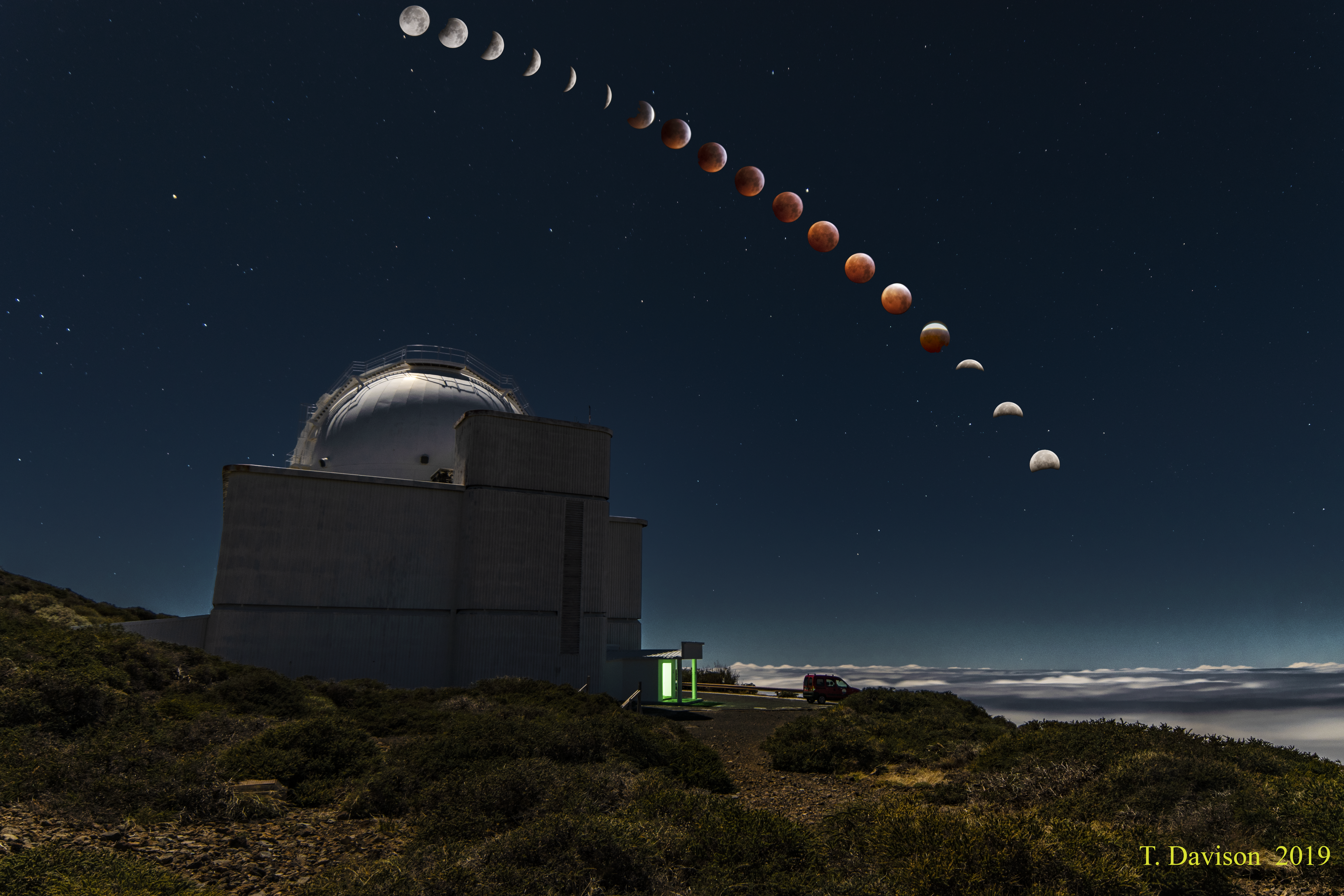 Description: On the 20th-21st of January, a lunar eclipse occurred visible from La Palma. This coincided with a 'supermoon' event, making the moon appear larger than normal. The photo is a composite of ~5 hours of lunar motion, as the moon traveled through the earth's shadow, and out the other side. Credit: Thomas Davison.