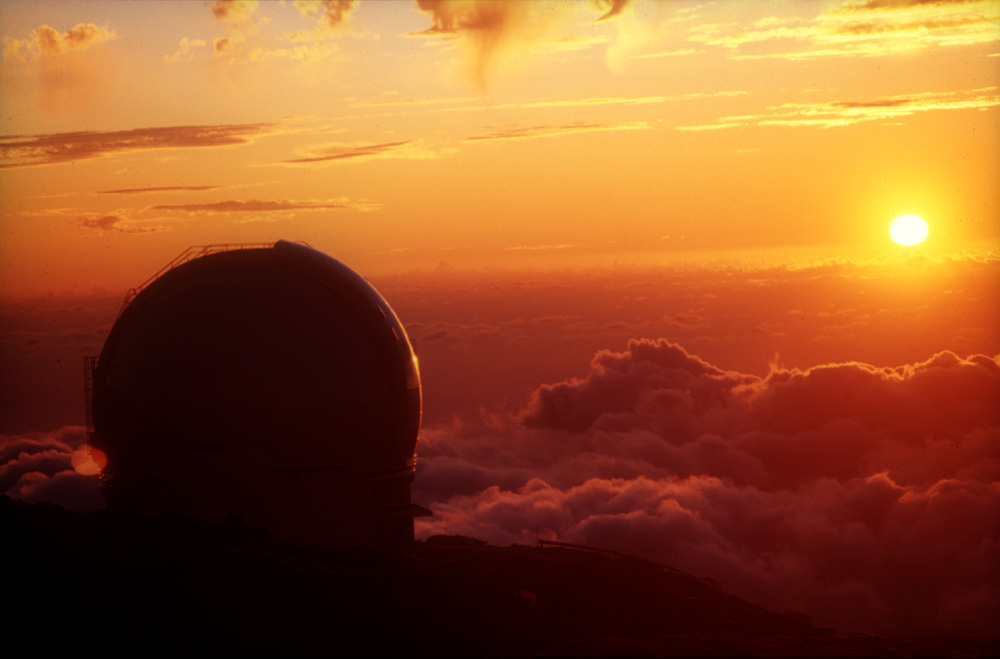 Caption: WHT dome and the shadow of La Palma in the background at sunrise.