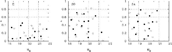 Figure 7. Distribution of E, S0, and Sa galaxies in the SAURON sample in the plane of ellipticity epsilon versus absolute blue magnitude MB. Open circles: field galaxies. Solid circles: cluster galaxies [ GIF | TIFF ]. The detailed measurements will be compared with fully general galaxy models constructed by means of Schwarzschild's numerical orbit superposition technique (e.g., Cretton et al., 1999). The dynamical modelling uses all appropriate imaging and spectral data that are available, including HST and OASIS spectra to constrain the mass of a central black hole. When combined with the constraints on the stellar populations derived from the line-strength distributions (Kuntschner & Davies, 1998), this will shed new light on the fundamental connections between the large and small scale dynamics, the formation (and existence) of supermassive black holes and galactic nuclei, and the history of metal enrichment in early-type galaxies.