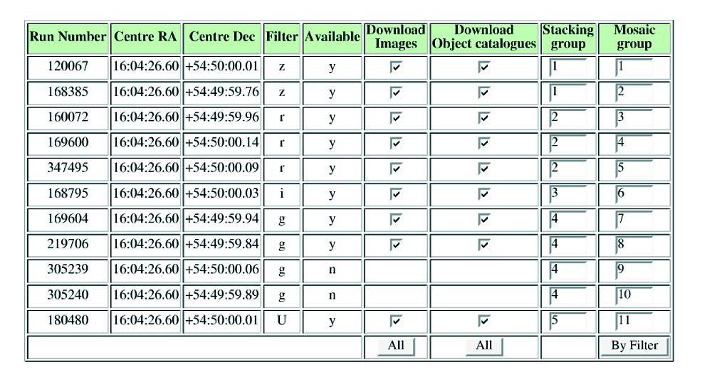 | Figure 4. Returned query listing the available images. Those fields with the search pointing on the CCD are selected by default. [ JPEG | TIFF ]. |