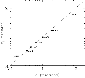 | Mean values of the rms. Zernike coefficient values for the whole JOSE data set, normalised to r0 = 20cm and plotted versus the theoretical (Noll) values for r0 = 20 cm. Values of n indicate Zernike radial order. This plot illustrates that the mean relative distribution of mode strengths is close to that predicted by Noll for free-atmospheric seeing. |
