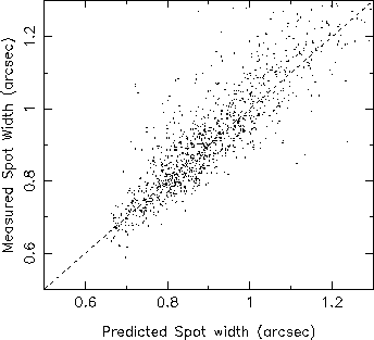 However we would expect such small scale aberrations to increase the FWHM of long exposure images from the sub-apertures of the JOSE sensor. Hence by comparing measured spot FWHM to their values predicted from the JOSE r0 estimates , we can determine whether there is any excess image spread due to unmeasured seeing aberrations. The figure below shows this analysis for the JOSE data set. Measured FWHM are plotted against the predicted spot widths for each data sample. The long exposure image was obtained by summing the exposures in each data sample. Spot FWHM for all unvignetted subapertures were found by fitting Gaussian profiles of variable width, binned to match the JOSE CCD pixel size. |